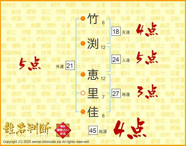 竹(6画)渕(12画) 恵(12画)里(7画)佳(8画)