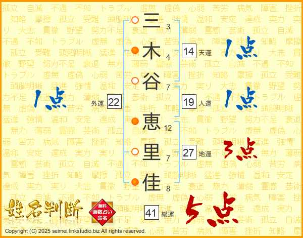 三(3画)木(4画)谷(7画) 恵(12画)里(7画)佳(8画)