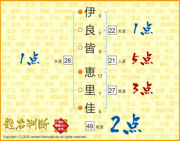 伊(6画)良(7画)皆(9画) 恵(12画)里(7画)佳(8画)