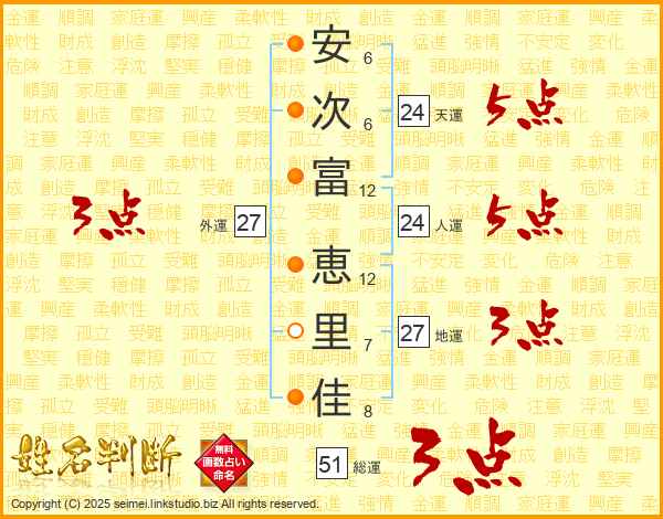 安(6画)次(6画)富(12画) 恵(12画)里(7画)佳(8画)