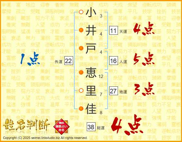小(3画)井(4画)戸(4画) 恵(12画)里(7画)佳(8画)
