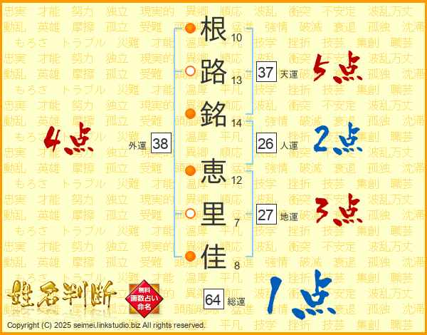 根(10画)路(13画)銘(14画) 恵(12画)里(7画)佳(8画)