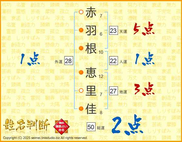 赤(7画)羽(6画)根(10画) 恵(12画)里(7画)佳(8画)