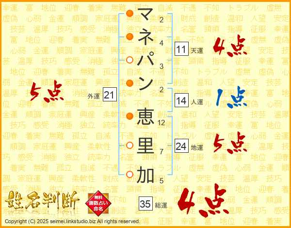 マ(2画)ネ(4画)パ(3画)ン(2画) 恵(12画)里(7画)加(5画)