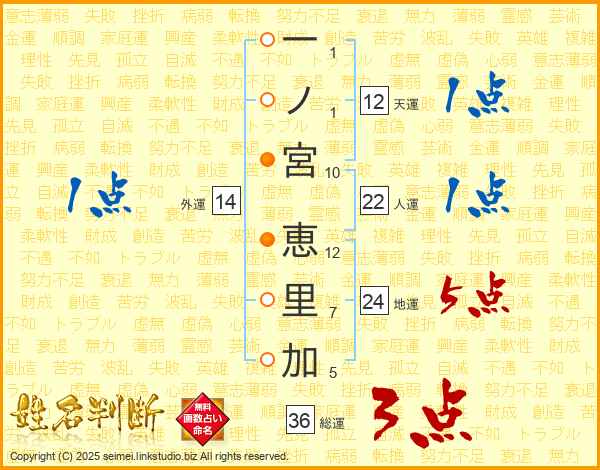 一(1画)ノ(1画)宮(10画) 恵(12画)里(7画)加(5画)