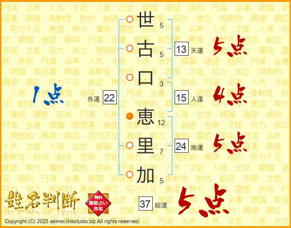 世(5画)古(5画)口(3画) 恵(12画)里(7画)加(5画)