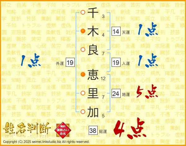 千(3画)木(4画)良(7画) 恵(12画)里(7画)加(5画)