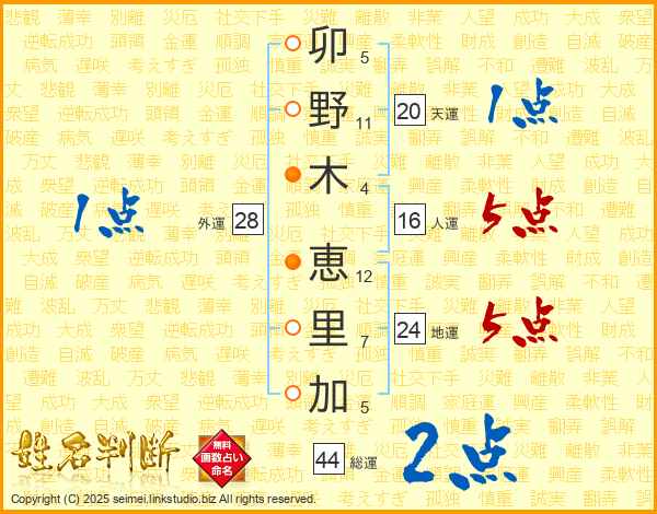 卯(5画)野(11画)木(4画) 恵(12画)里(7画)加(5画)
