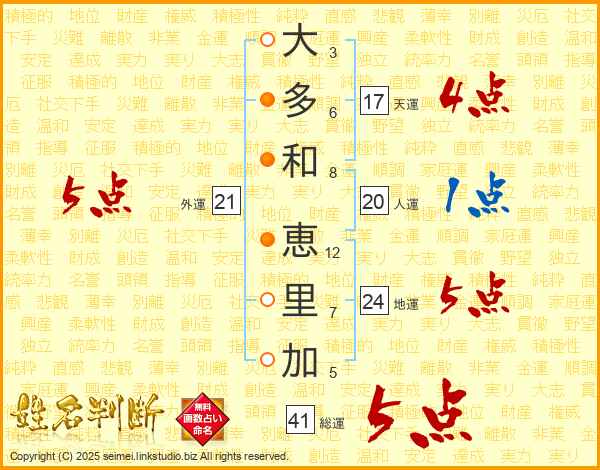 大(3画)多(6画)和(8画) 恵(12画)里(7画)加(5画)