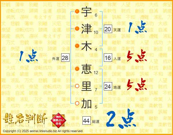 宇(6画)津(10画)木(4画) 恵(12画)里(7画)加(5画)