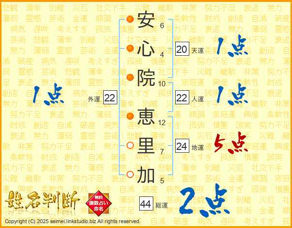 安(6画)心(4画)院(10画) 恵(12画)里(7画)加(5画)