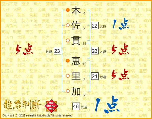木(4画)佐(7画)貫(11画) 恵(12画)里(7画)加(5画)