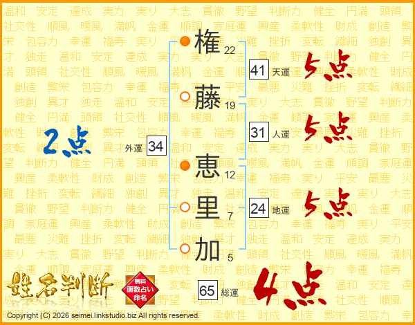 権(22画)藤(19画) 恵(12画)里(7画)加(5画)
