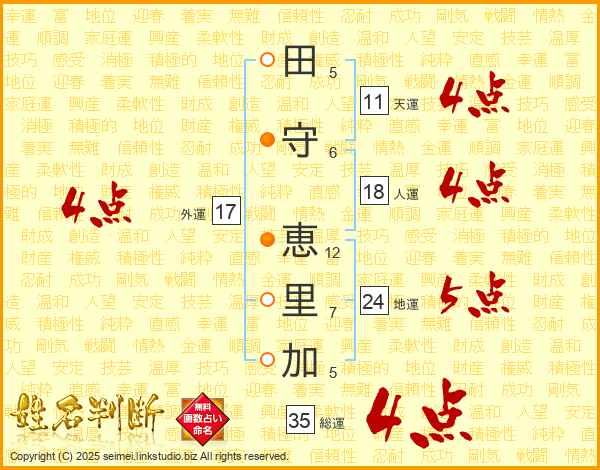 田(5画)守(6画) 恵(12画)里(7画)加(5画)