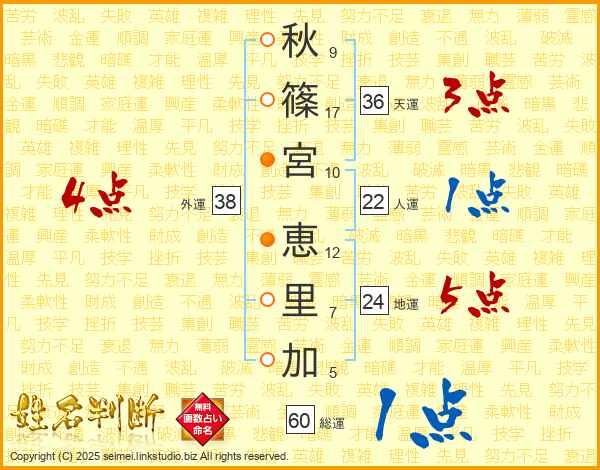 秋(9画)篠(17画)宮(10画) 恵(12画)里(7画)加(5画)