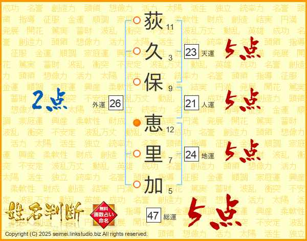 荻(11画)久(3画)保(9画) 恵(12画)里(7画)加(5画)