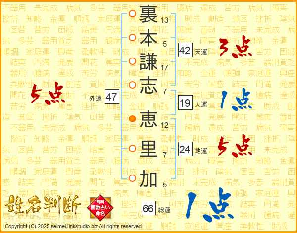 裏(13画)本(5画)謙(17画)志(7画) 恵(12画)里(7画)加(5画)