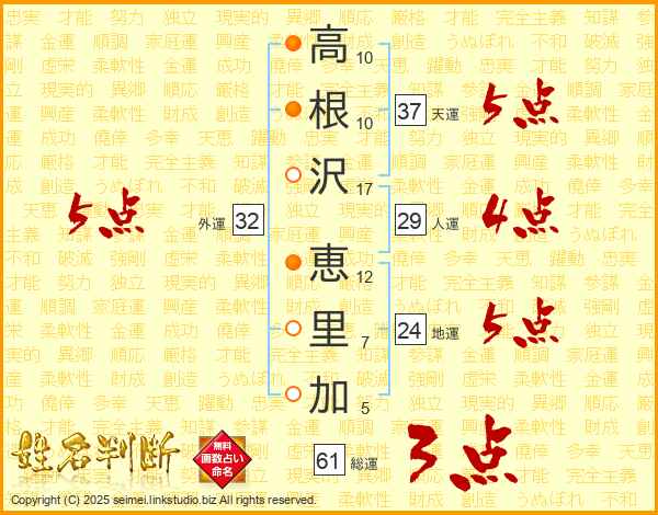 高(10画)根(10画)沢(17画) 恵(12画)里(7画)加(5画)