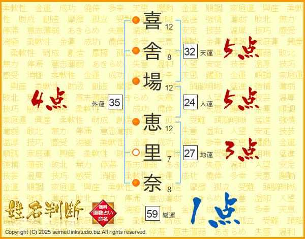 喜(12画)舎(8画)場(12画) 恵(12画)里(7画)奈(8画)