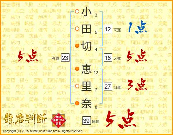 小田切恵里奈さんの総運は39画の5点!