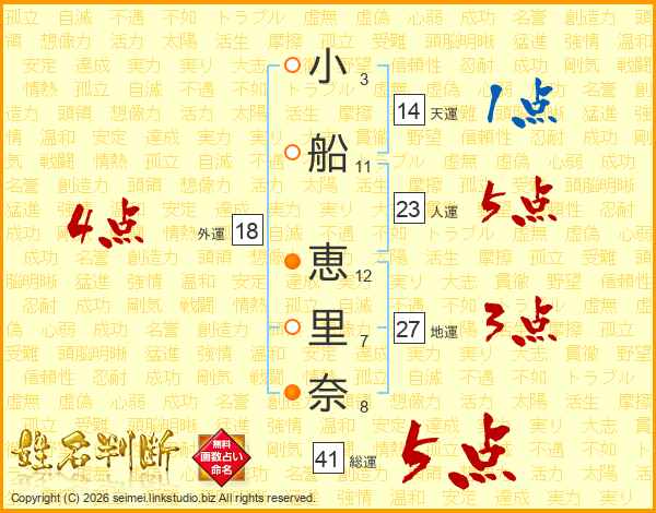 小(3画)船(11画) 恵(12画)里(7画)奈(8画)