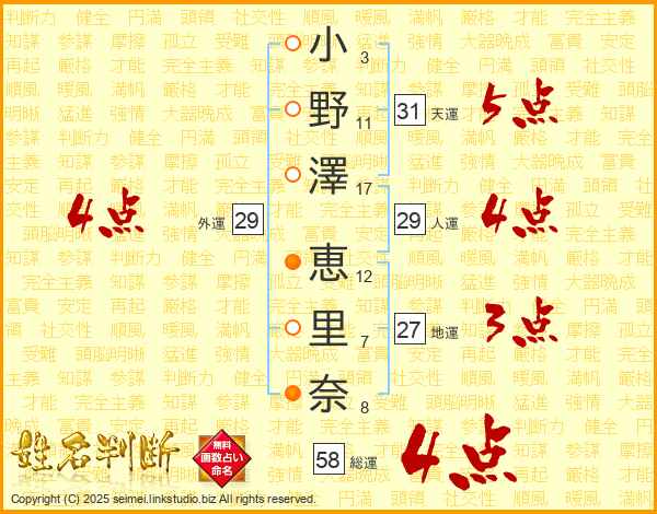 小(3画)野(11画)澤(17画) 恵(12画)里(7画)奈(8画)
