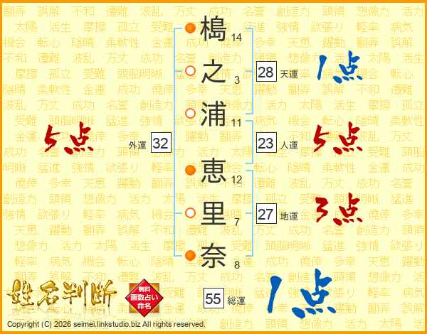 槝(14画)之(3画)浦(11画) 恵(12画)里(7画)奈(8画)