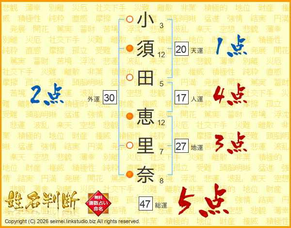 小(3画)須(12画)田(5画) 恵(12画)里(7画)奈(8画)