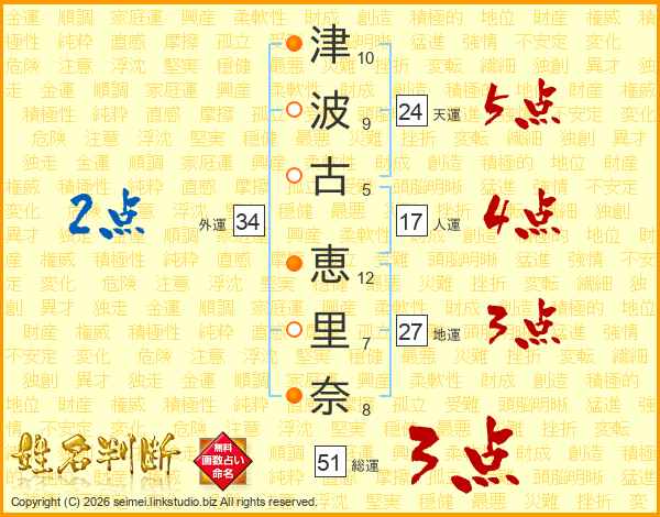 津(10画)波(9画)古(5画) 恵(12画)里(7画)奈(8画)