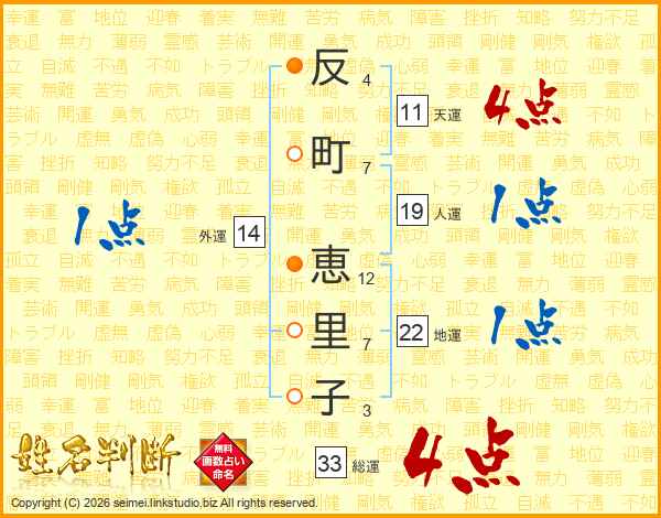 反(4画)町(7画) 恵(12画)里(7画)子(3画)
