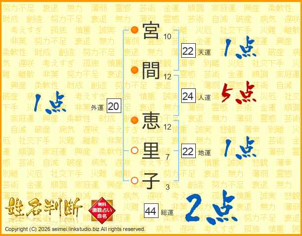 宮(10画)間(12画) 恵(12画)里(7画)子(3画)
