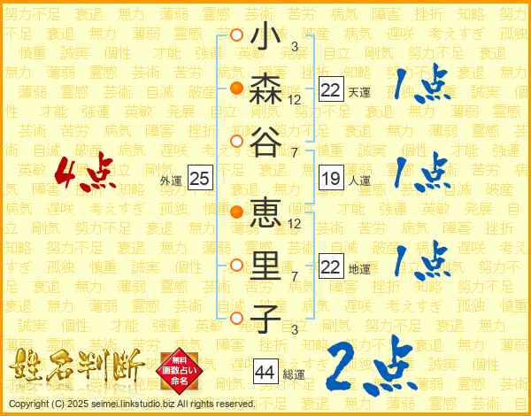 小森谷恵里子さんの総運は44画の2点!