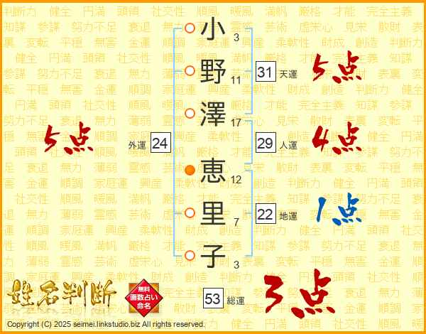 小(3画)野(11画)澤(17画) 恵(12画)里(7画)子(3画)