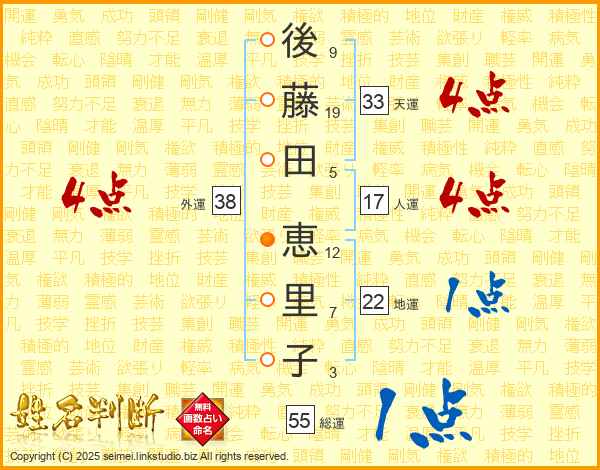 後(9画)藤(19画)田(5画) 恵(12画)里(7画)子(3画)