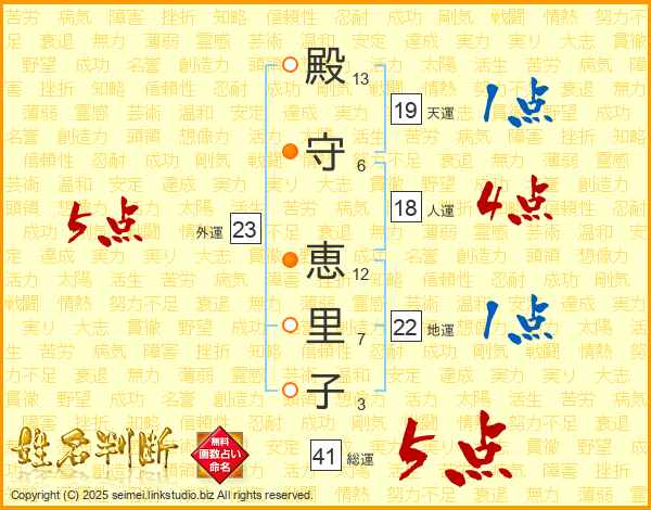 殿(13画)守(6画) 恵(12画)里(7画)子(3画)