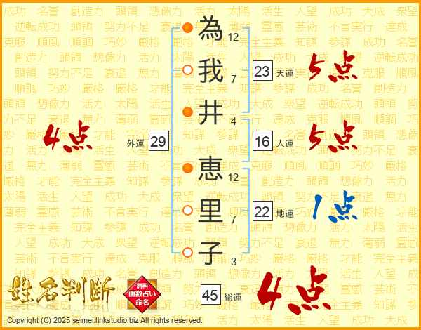 為(12画)我(7画)井(4画) 恵(12画)里(7画)子(3画)