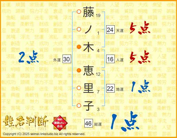 藤(19画)ノ(1画)木(4画) 恵(12画)里(7画)子(3画)