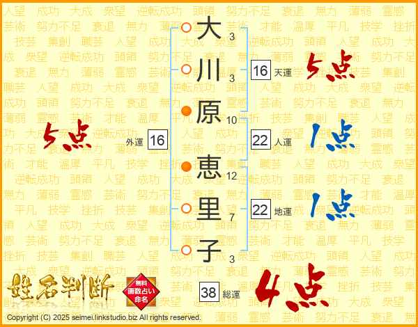 大(3画)川(3画)原(10画) 恵(12画)里(7画)子(3画)