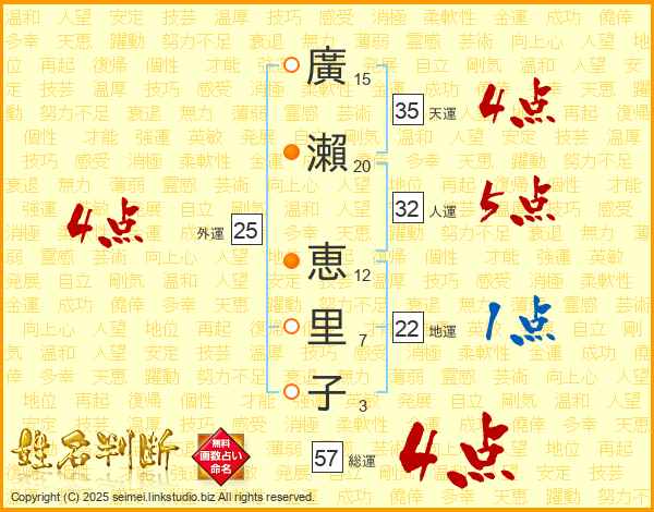 廣(15画)瀨(20画) 恵(12画)里(7画)子(3画)