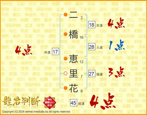二(2画)橋(16画) 恵(12画)里(7画)花(8画)