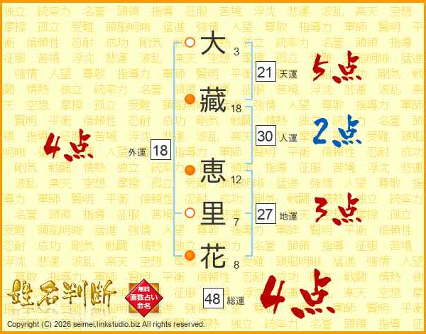 大(3画)藏(18画) 恵(12画)里(7画)花(8画)