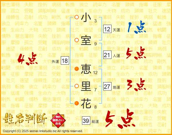 小(3画)室(9画) 恵(12画)里(7画)花(8画)