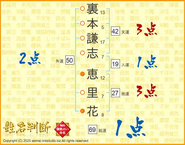 裏本謙志恵里花さんの総運は69画の1点!