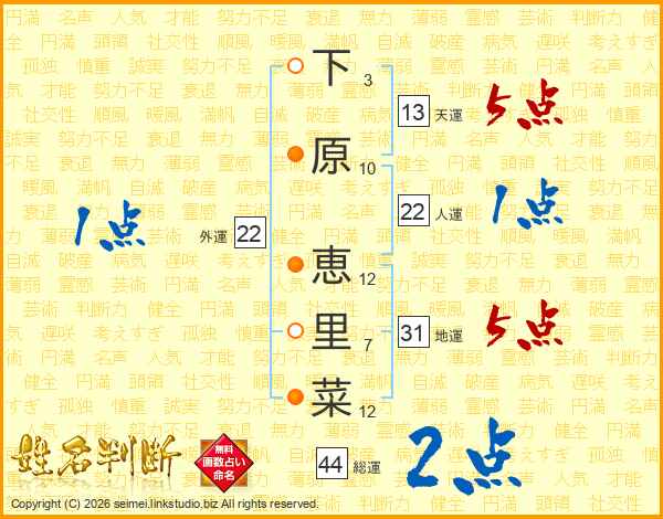 下原恵里菜さんの総運は44画の2点!
