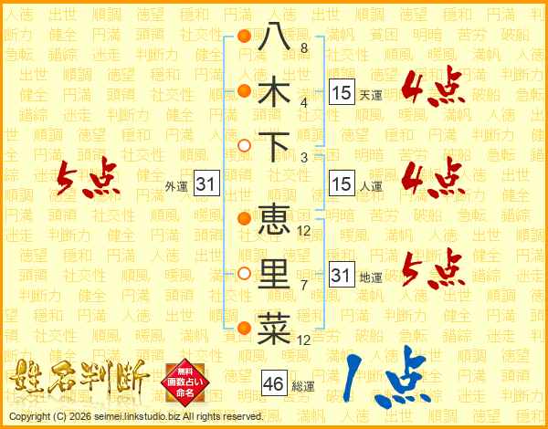 八(8画)木(4画)下(3画) 恵(12画)里(7画)菜(12画)
