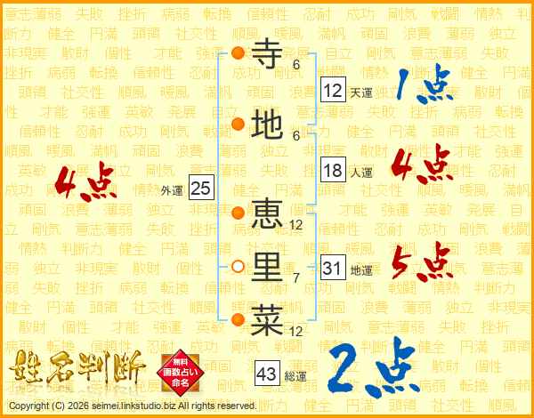 寺(6画)地(6画) 恵(12画)里(7画)菜(12画)