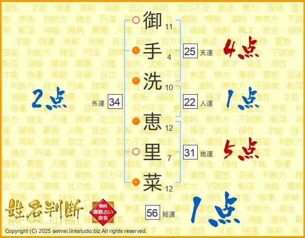 御(11画)手(4画)洗(10画) 恵(12画)里(7画)菜(12画)