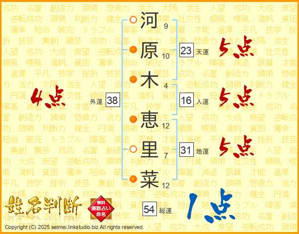 河(9画)原(10画)木(4画) 恵(12画)里(7画)菜(12画)
