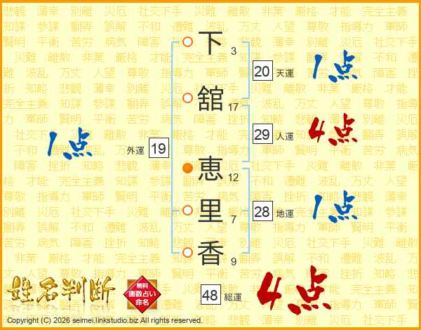 下(3画)舘(17画) 恵(12画)里(7画)香(9画)