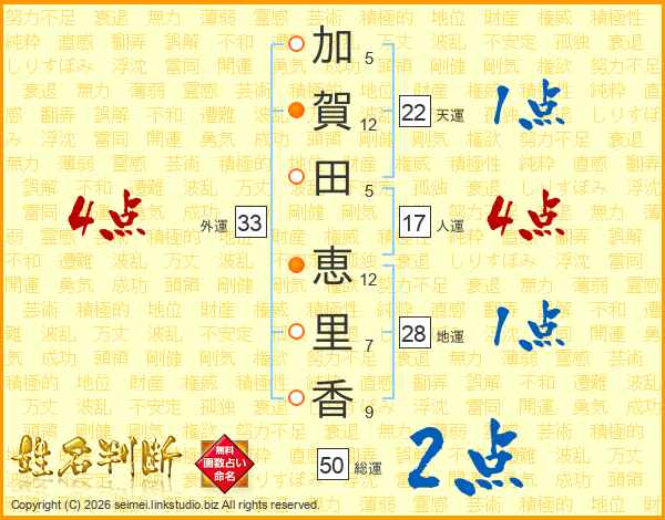 加(5画)賀(12画)田(5画) 恵(12画)里(7画)香(9画)